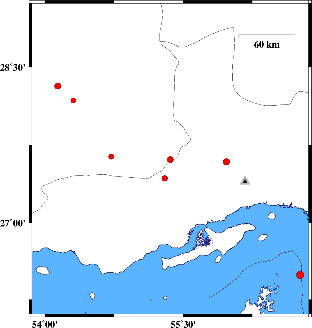 2008/01/23 | 22:09:19.3 | 01:39:19.3 | 26.49 | 56.77 | 18 | ML3.6 | Oman Sea, 72 km South-East of Qeshm | ||