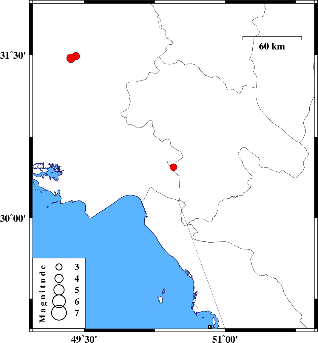 2008/01/05 | 07:09:48.8 | 10:39:48.8 | 31.49 | 49.41 | 26 | ML3.7 | 30 km North-West of Ramhormoz, Khoozestan Province |