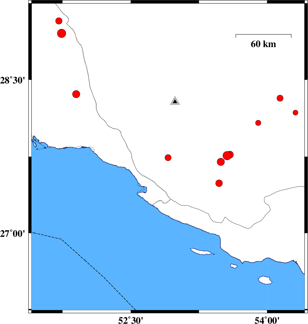2008/01/28 | 01:20:20.3 | 04:50:20.3 | 28.95 | 51.74 | 41 | ML4.3 | 34 km West of Farashband, Fars Province | ||