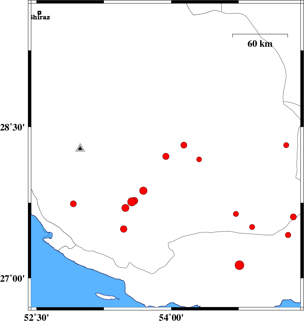 2008/01/30 | 09:34:27.8 | 13:04:27.8 | 28.32 | 54.14 | 14 | ML3.1 | 59 km South-East of Jahrom, Fars Province | ||