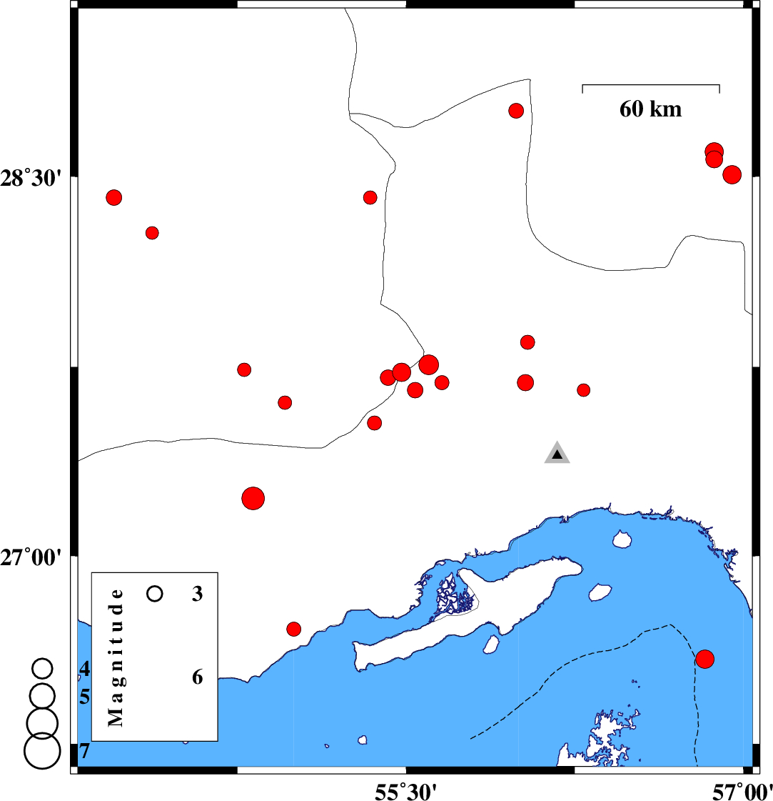 2008/01/23 | 22:09:19.3 | 01:39:19.3 | 26.49 | 56.77 | 18 | ML3.6 | Oman Sea, 72 km South-East of Qeshm | ||