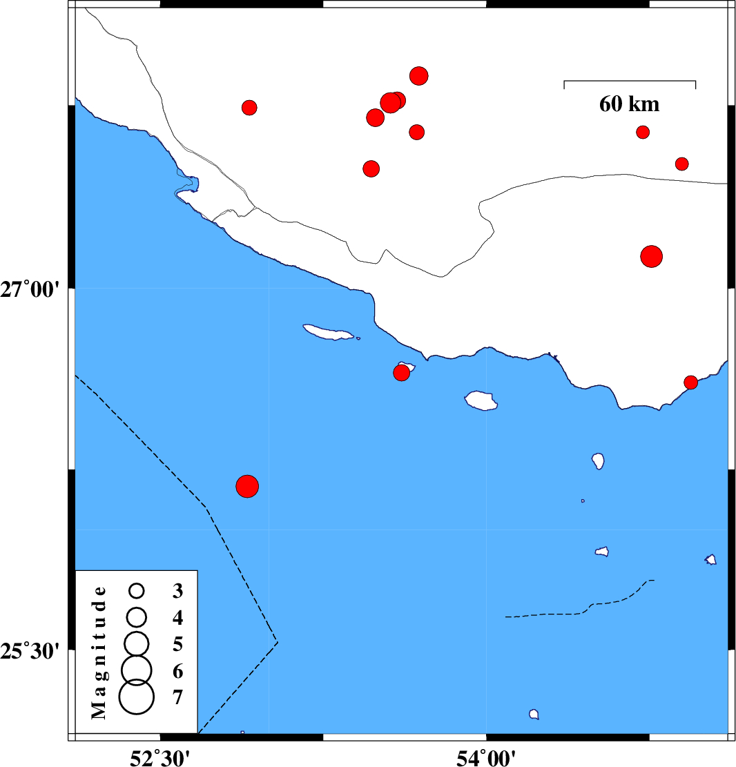 2008/02/11 | 19:10:37.2 | 22:40:37.2 | 26.65 | 53.61 | 39 | ML3.4 | Persian Gulf, 87 km South-East of Lamerd | ||