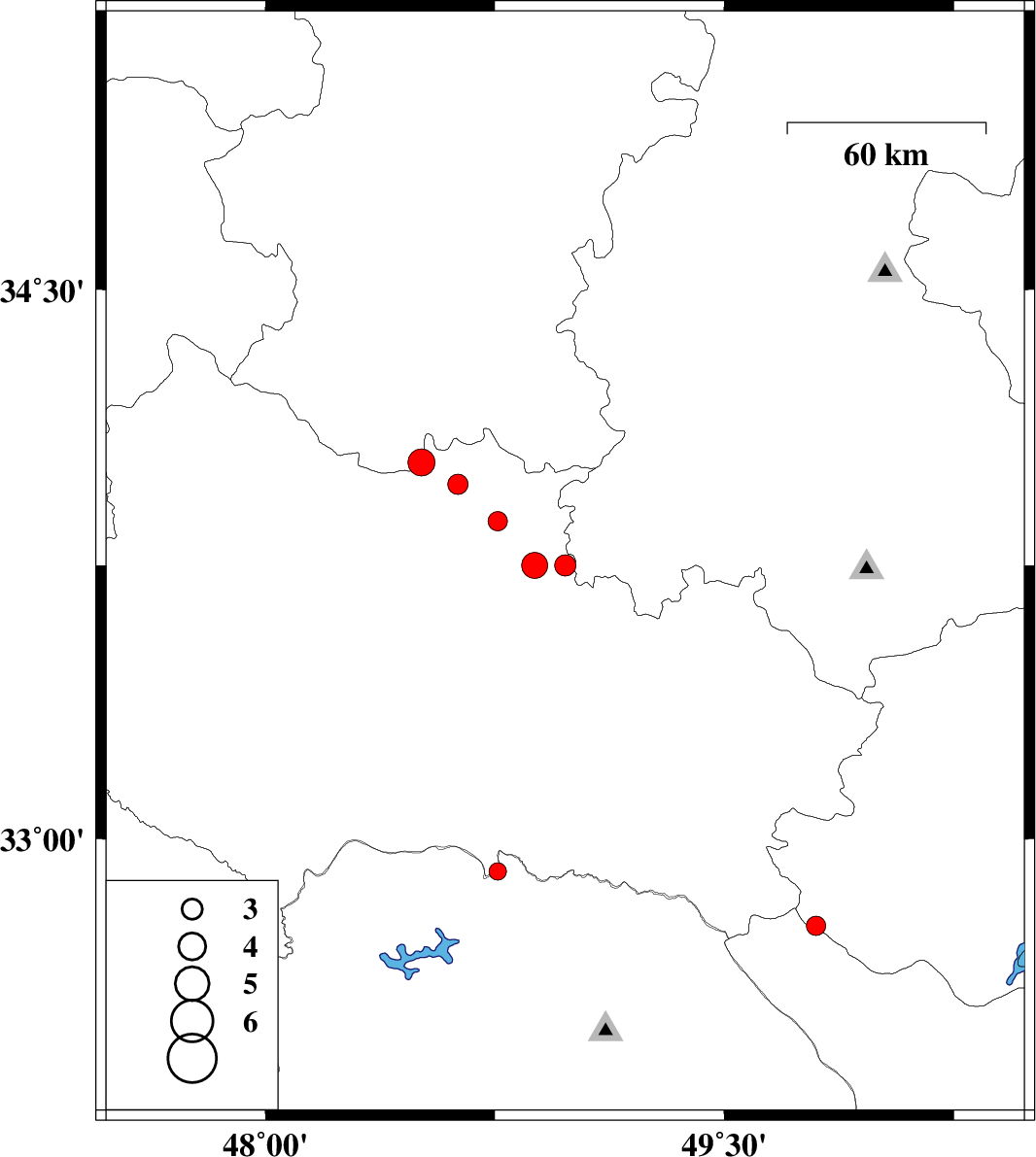 | 2008/01/21 | 01:41:34.8 | 05:11:34.8 | 32.91 | 48.76 | 14 | ML2.5 | 63 km North-East of Andimeshk, Khoozestan Province |