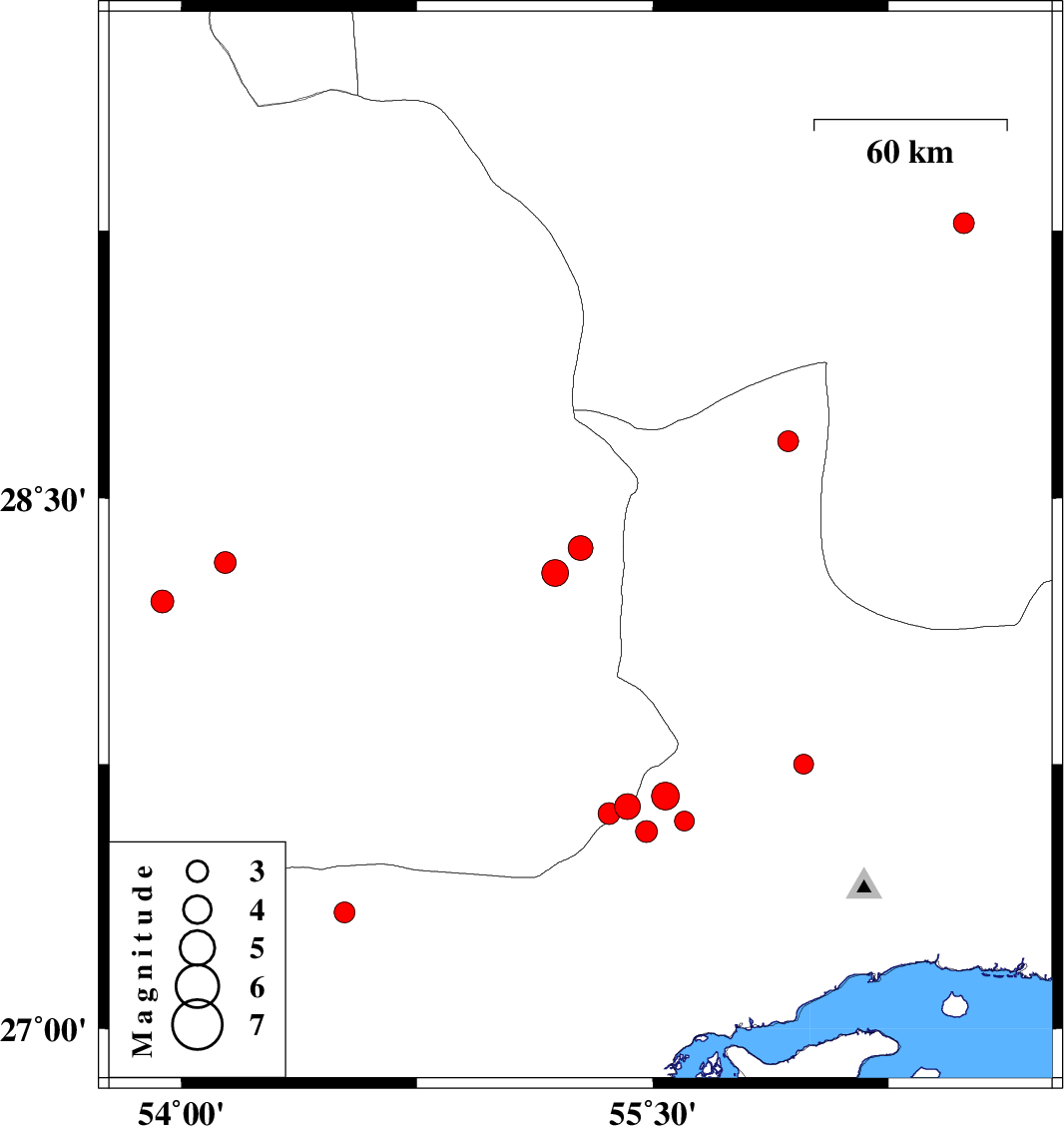 2008/02/16 | 22:27:42.3 | 01:57:42.3 | 27.33 | 54.52 | 15 | ML2.9 | 20 km North-East of Bastak, Hormozgan Province | ||