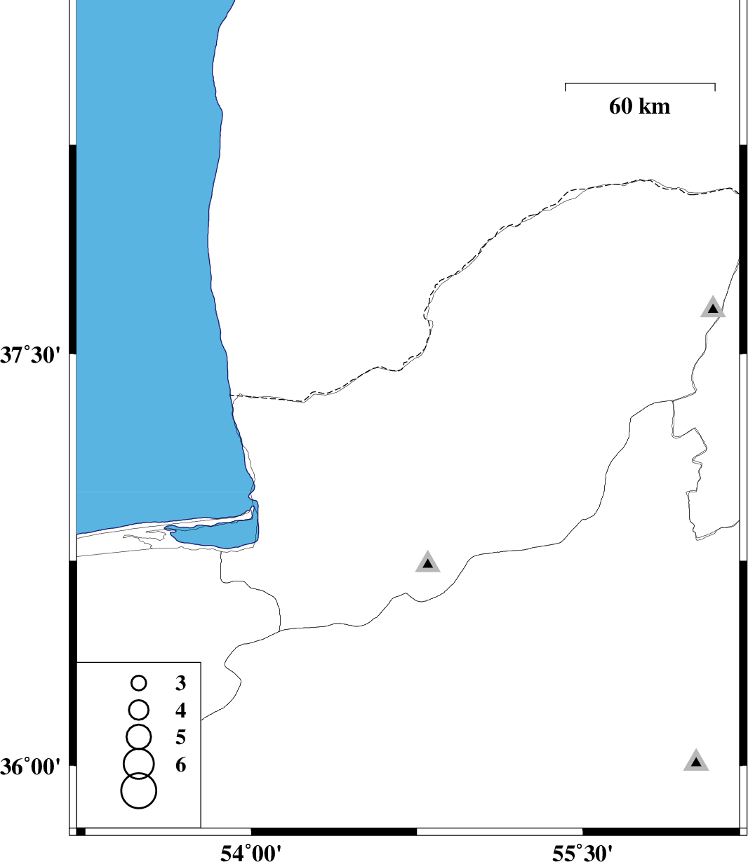 | 2008/03/06 | 20:21:54.5 | 23:51:54.5 | 37.27 | 54.71 | 35 | ML2.8 | 35 km North-East of Aq Qaleh, Golestan Province |