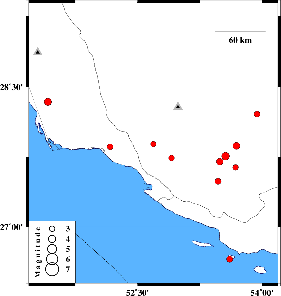 2008/03/07 | 05:54:11.1 | 09:24:11.1 | 27.89 | 52.69 | 0 | ML3 | 37 km East of Jam, Bushehr Province | ||