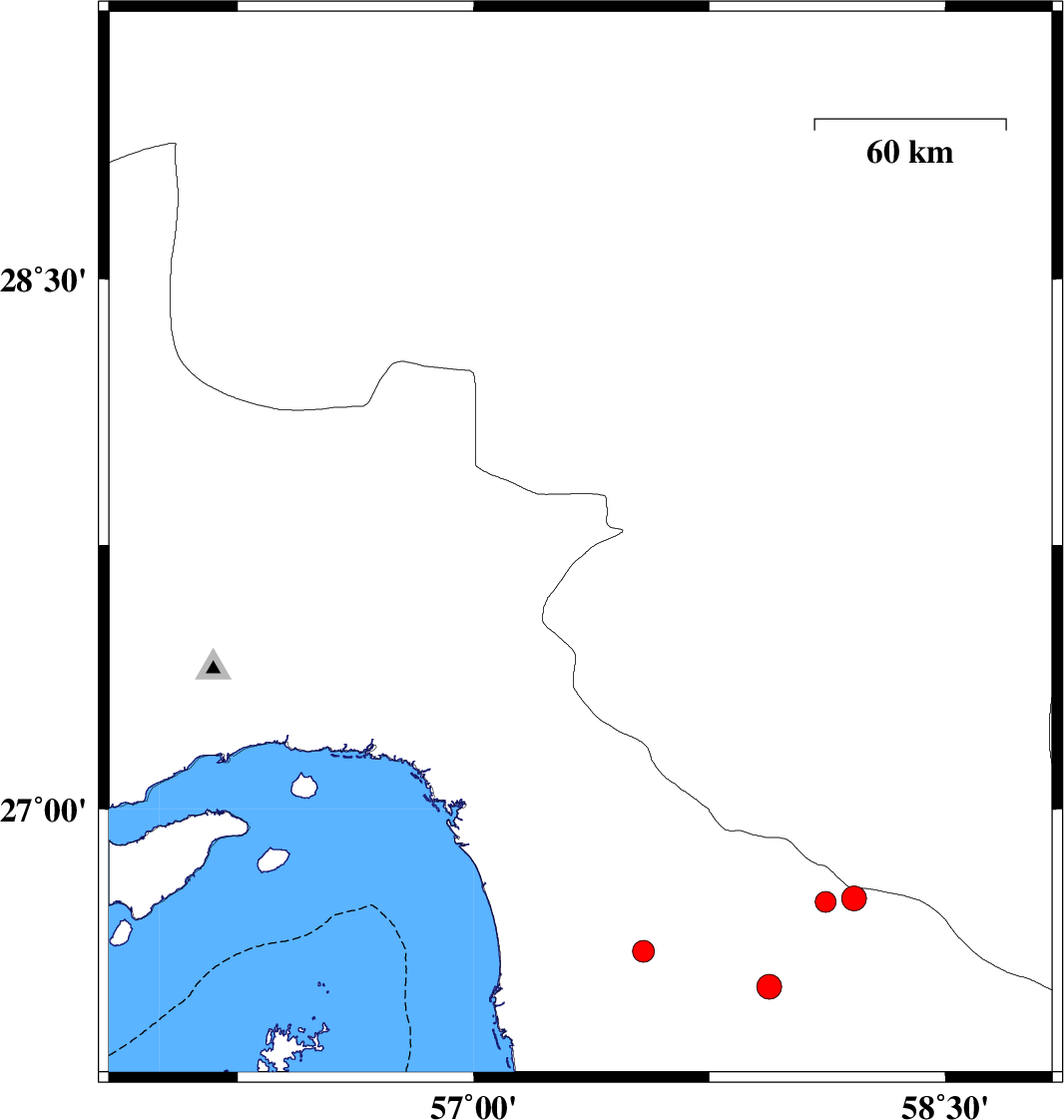 2008/03/11 | 02:06:00.6 | 05:36:00.6 | 27.85 | 56.94 | 34 | ML3.1 | 55 km North-West of Dehbarez, Hormozgan Province | ||