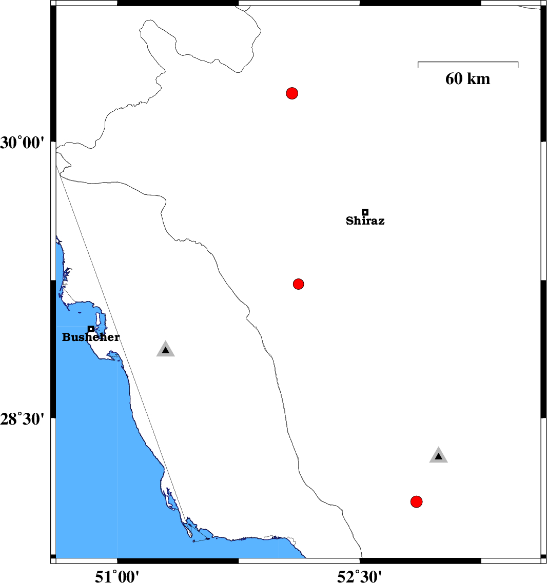 | 2008/03/10 | 01:41:35.4 | 05:11:35.4 | 28.04 | 52.85 | 27 | ML3.3 | 50 km South-West of Qir va Karzin, Fars Province |