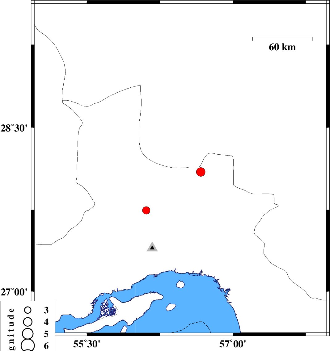 2008/03/23 | 06:51:53.2 | 11:21:53.2 | 28.12 | 56.46 | 15 | ML3.5 | 58 km South-East of Hajiabad, Hormozgan Province | ||