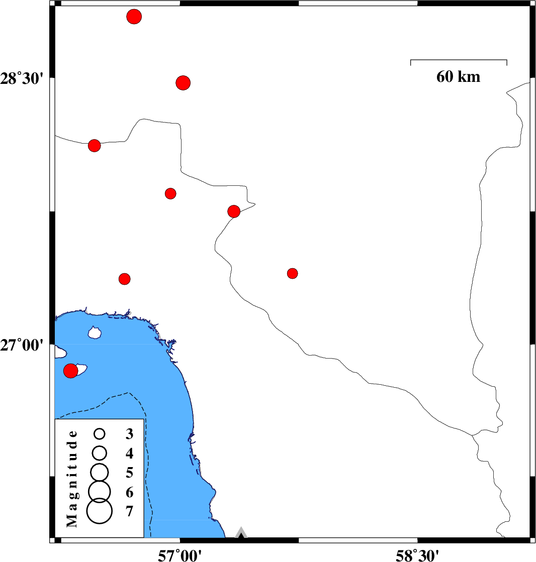 2008/03/11 | 14:03:46.4 | 17:33:46.4 | 27.75 | 57.34 | 38 | ML3.5 | 37 km North-East of Dehbarez, Hormozgan Province | ||