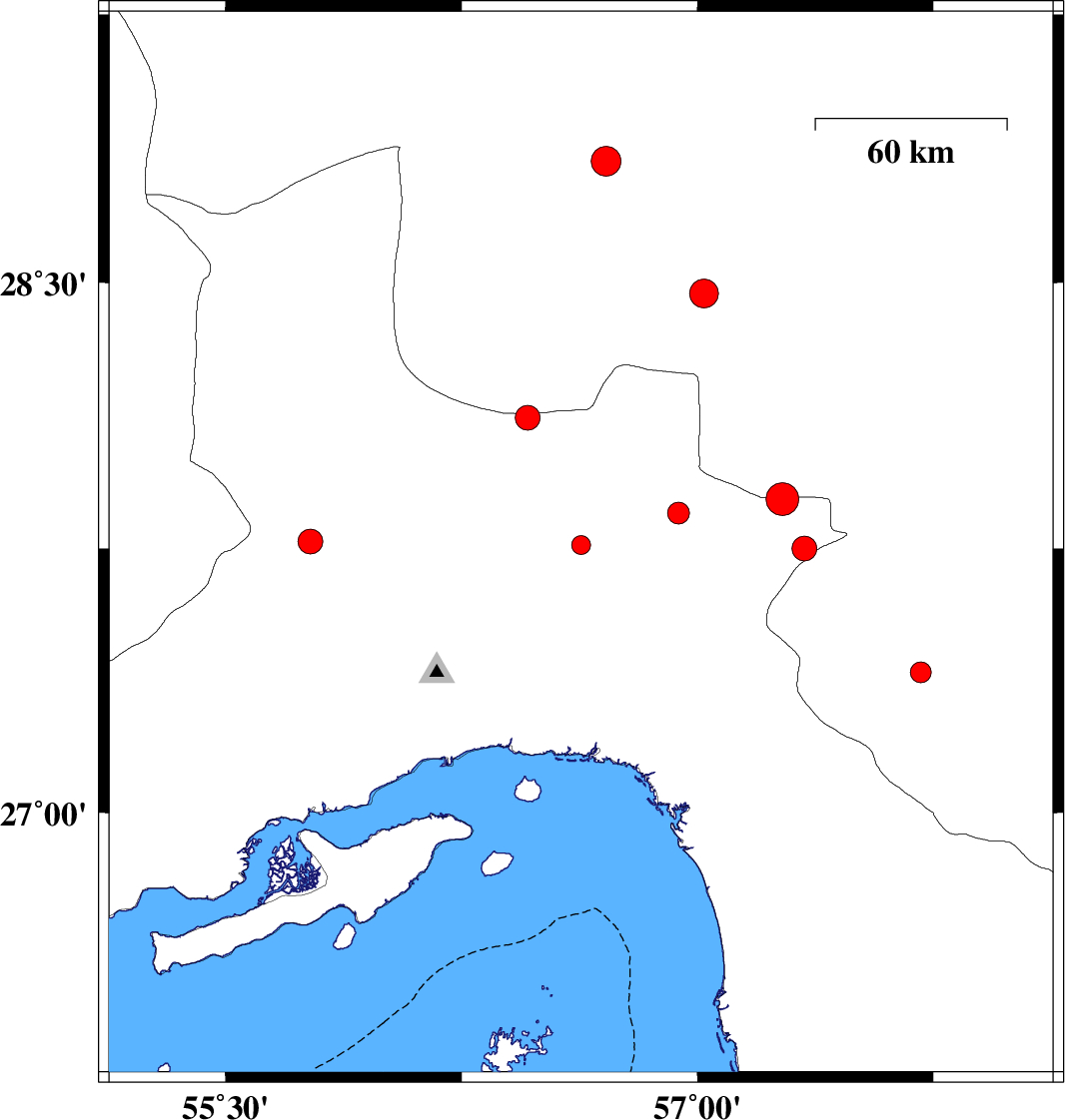 2008/03/11 | 02:06:00.6 | 05:36:00.6 | 27.85 | 56.94 | 34 | ML3.1 | 55 km North-West of Dehbarez, Hormozgan Province |