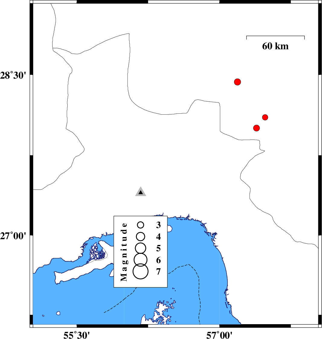 2008/04/06 | 18:42:54.2 | 23:12:54.2 | 27.76 | 56.63 | 14 | ML2.7 | 70 km North-West of Dehbarez, Hormozgan Province |