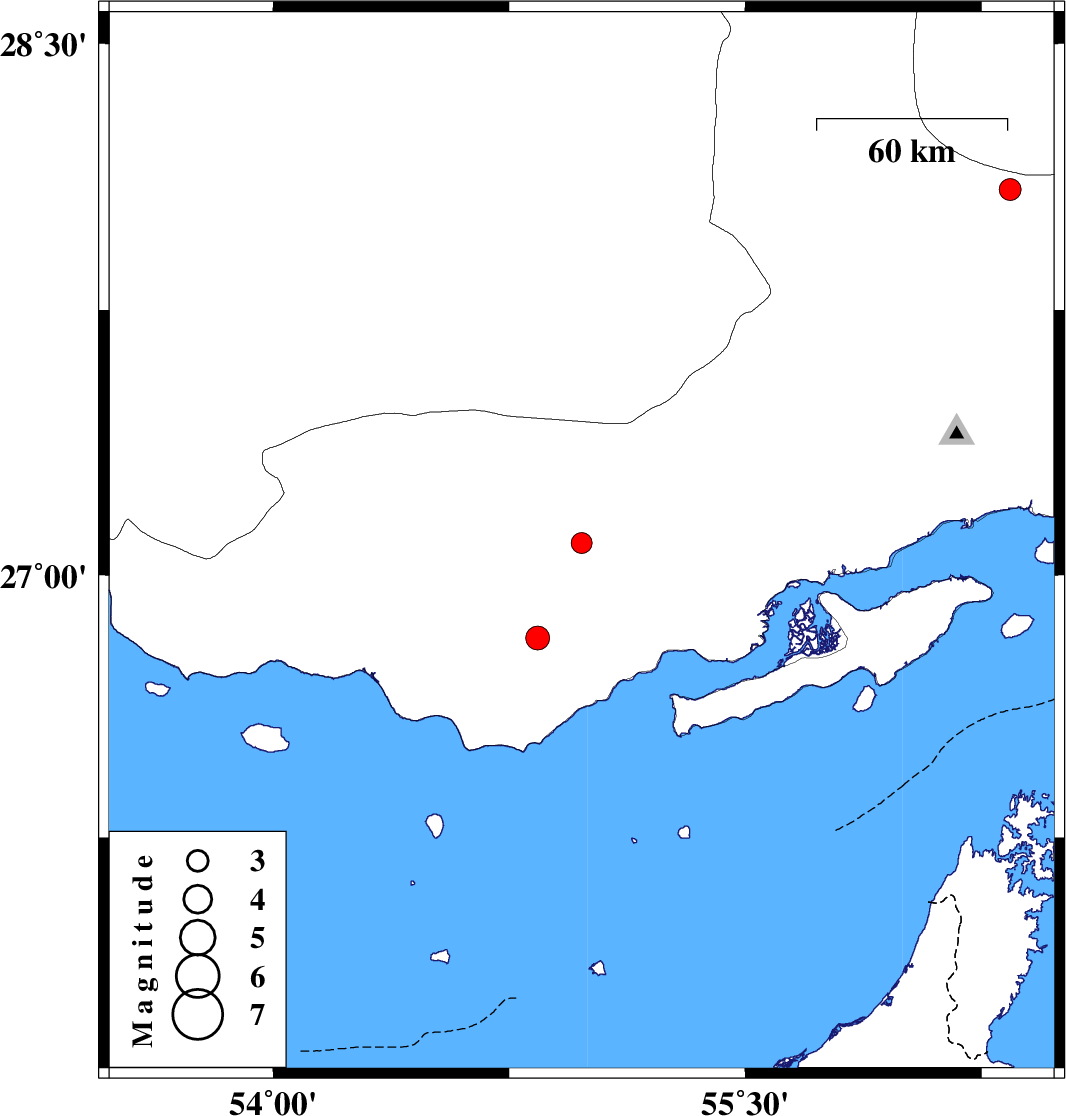 2008/04/12 | 16:33:04.8 | 21:03:04.8 | 27.09 | 54.98 | 15 | ML2.9 | 62 km South-East of Bastak, Hormozgan Province | ||