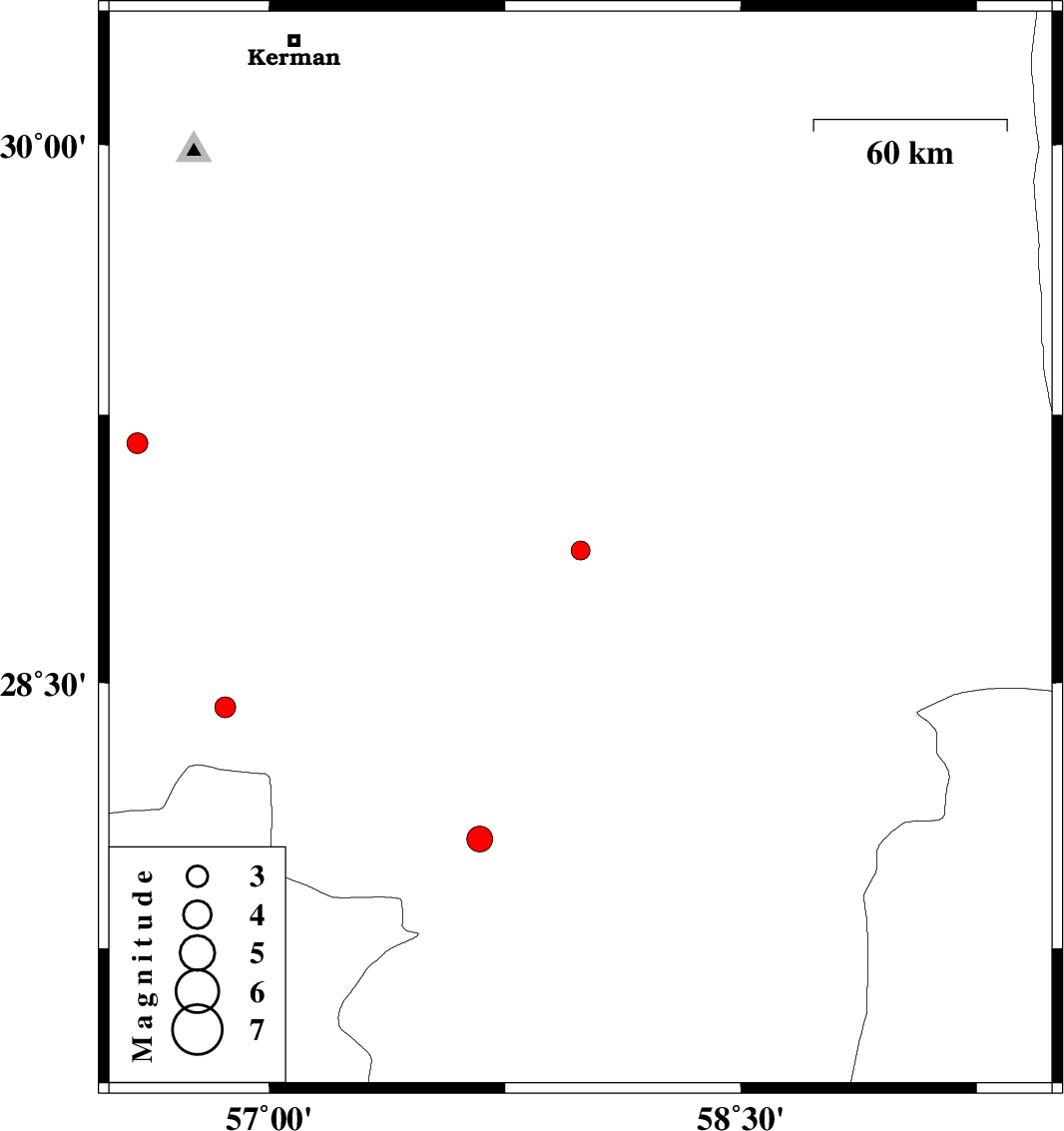 2008/04/11 | 19:37:41.9 | 00:07:41.9 | 28.43 | 56.86 | 29 | ML3 | 89 km South-West of Jiroft, Kerman Province | ||