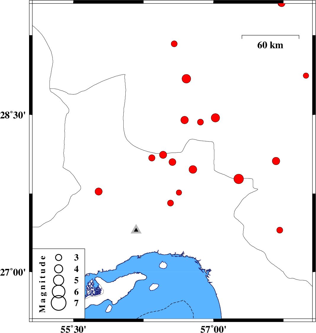2008/04/11 | 19:37:41.9 | 00:07:41.9 | 28.43 | 56.86 | 29 | ML3 | 89 km South-West of Jiroft, Kerman Province | ||
