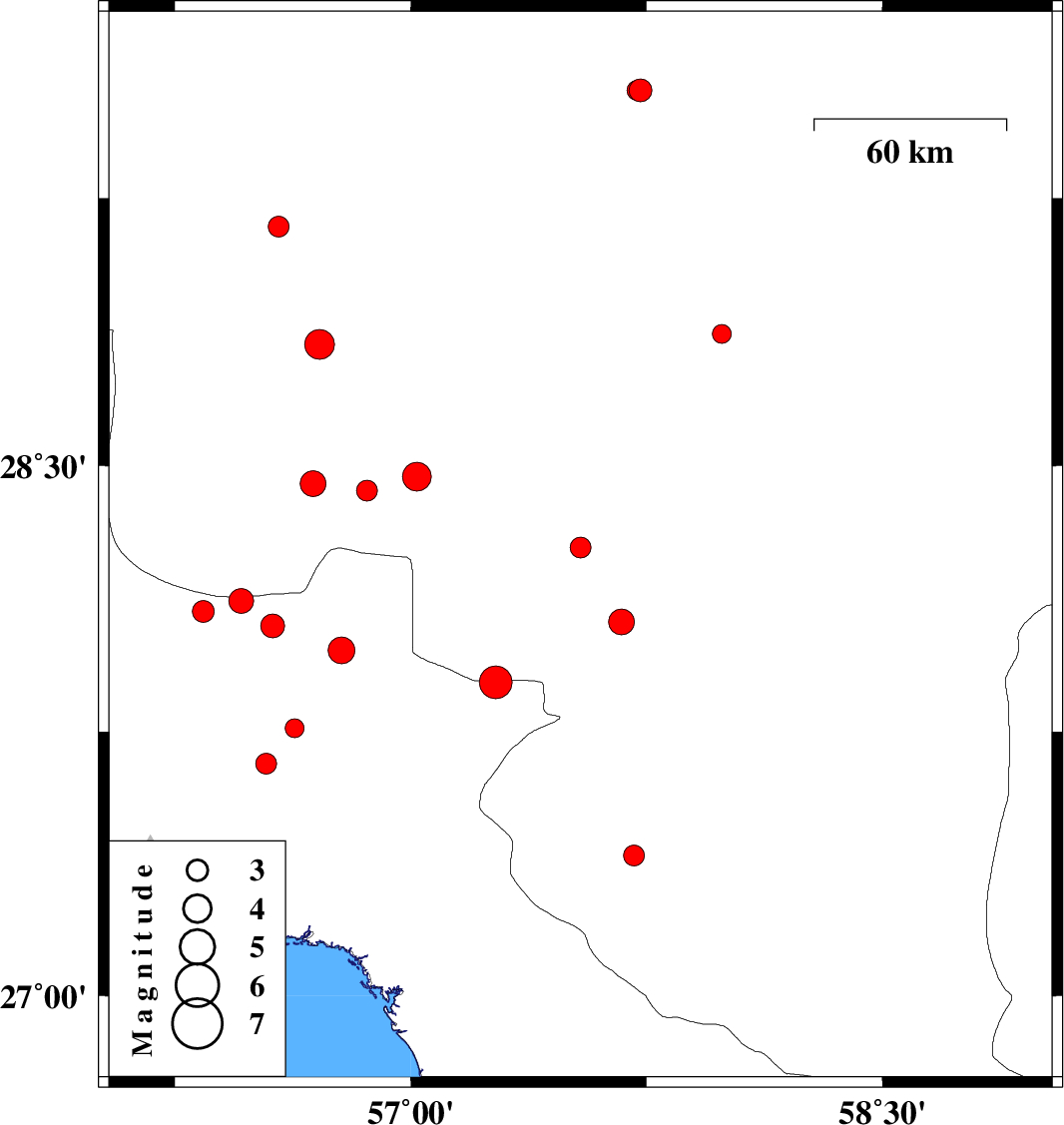 2008/03/31 | 12:35:10.4 | 17:05:10.4 | 27.89 | 57.27 | 38 | ML4.7 | 42 km West of Kahnuj, Kerman Province | ||