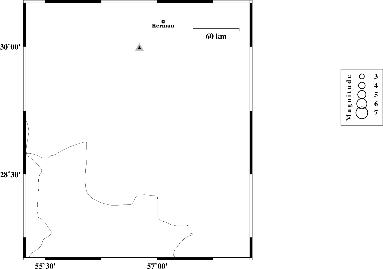 2008/03/31 | 12:35:10.4 | 17:05:10.4 | 27.89 | 57.27 | 38 | ML4.7 | 42 km West of Kahnuj, Kerman Province | ||