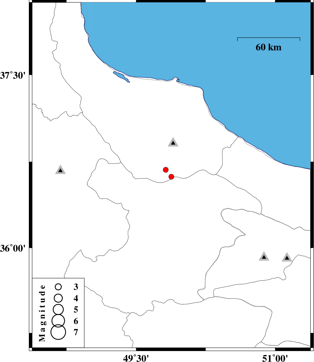 | 2008/04/23 | 20:56:37.8 | 01:26:37.8 | 36.68 | 49.82 | 14 | ML2.5 | 38 km South-East of Rudbar, Gilan Province |