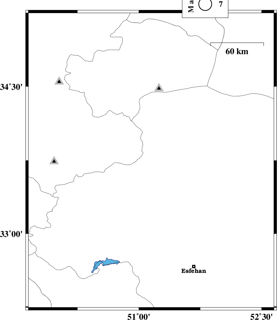 2008/05/07 | 09:16:58.0 | 13:46:58.0 | 33.74 | 51.15 | 26 | ML2.9 | 38 km South-West of Kashan, Esfahan Province |