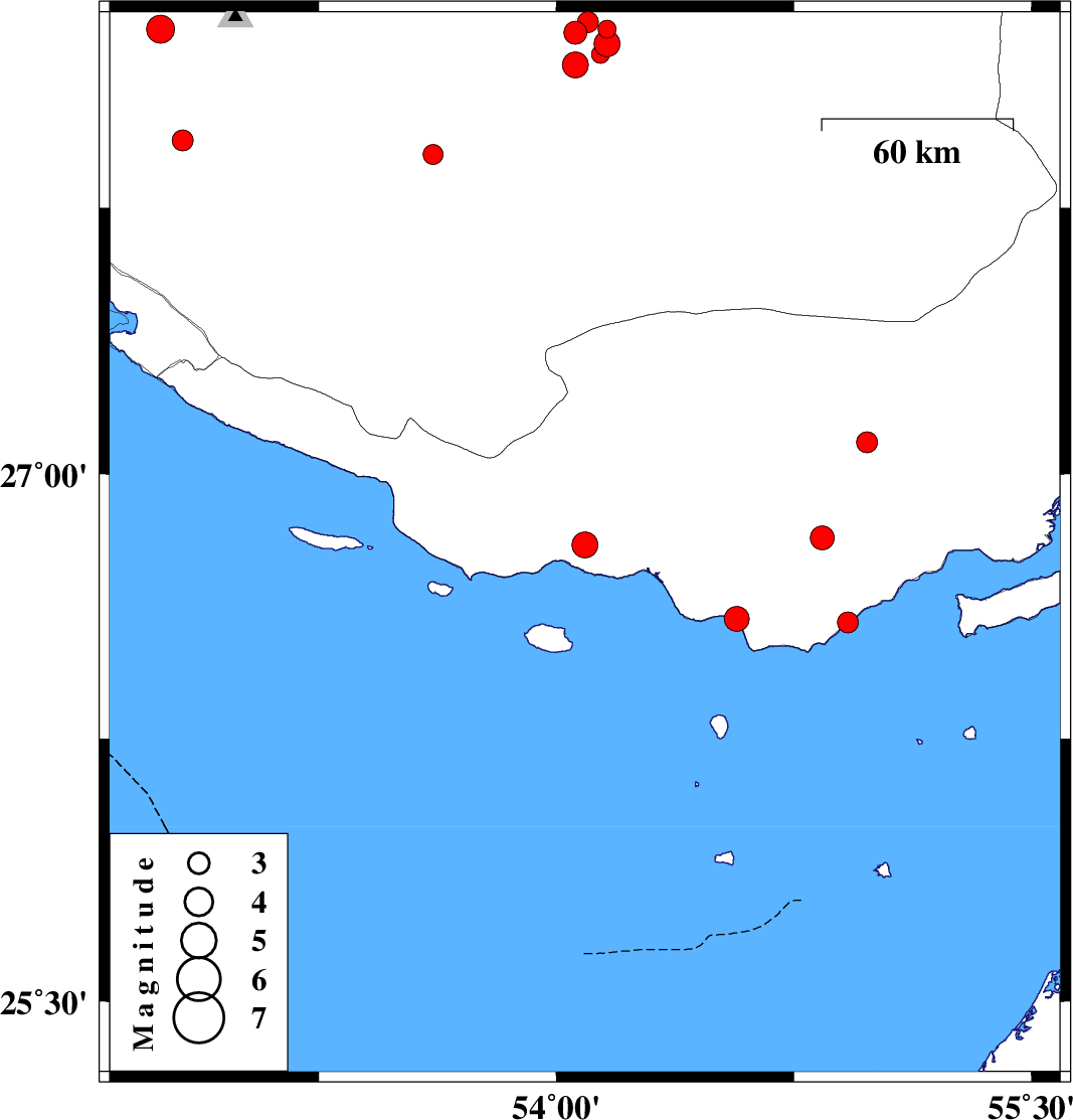 2008/05/07 | 12:07:28.0 | 16:37:28.0 | 26.8 | 54.09 | 34 | ML3.7 | 52 km South-West of Bastak, Hormozgan Province | ||