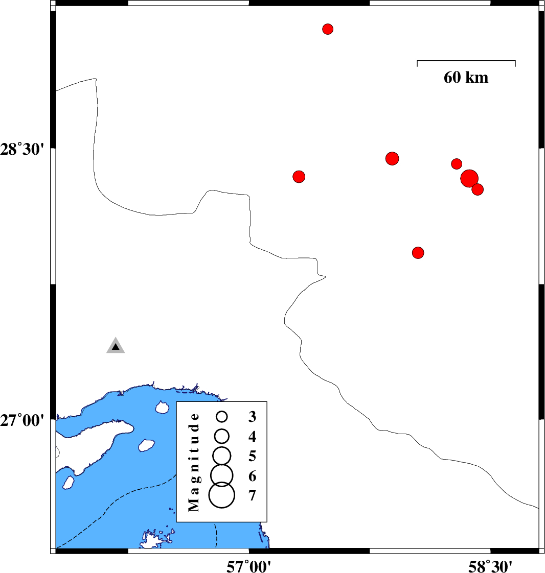 2008/05/08 | 14:24:31.8 | 18:54:31.8 | 28.13 | 57.67 | 15 | ML3.3 | 19 km North of Kahnuj, Kerman Province | ||