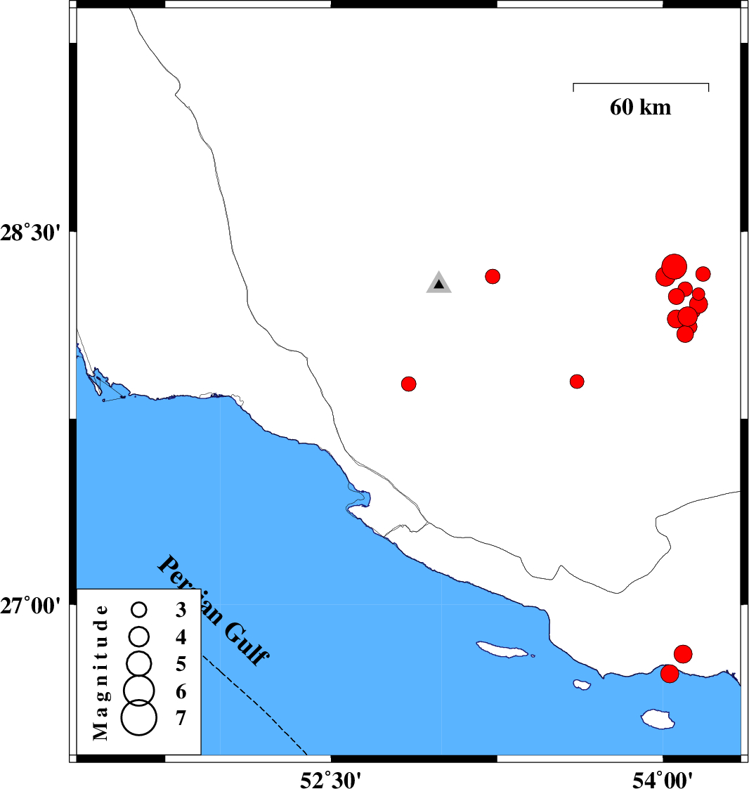2008/04/29 | 05:55:11.4 | 10:25:11.4 | 28.32 | 54.01 | 37 | ML3.9 | 48 km South-East of Jahrom, Fars Province | ||
