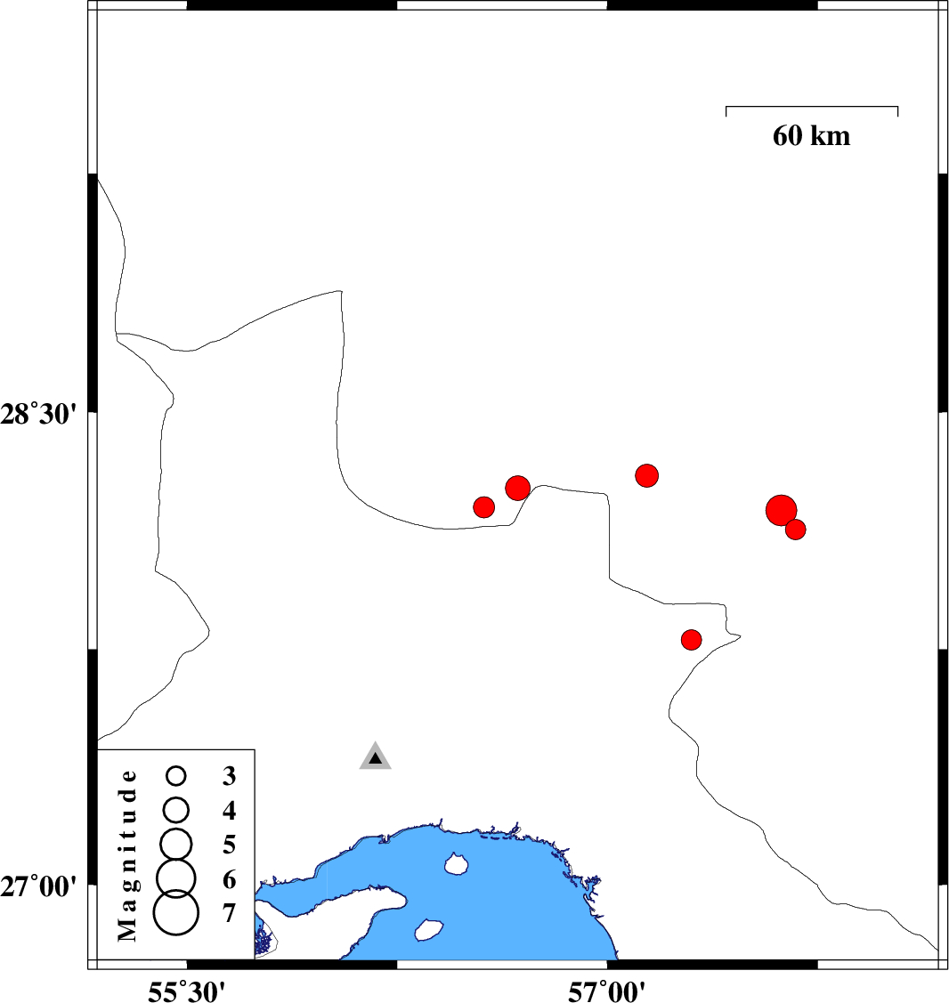 2008/05/08 | 14:24:31.8 | 18:54:31.8 | 28.13 | 57.67 | 15 | ML3.3 | 19 km North of Kahnuj, Kerman Province | ||