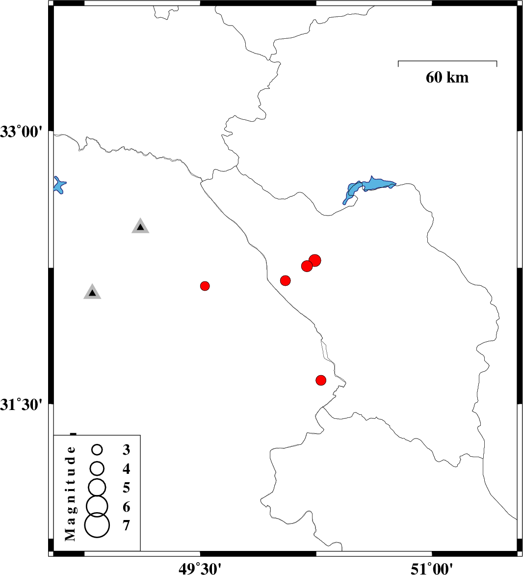 | 2008/05/19 | 05:17:18.2 | 09:47:18.2 | 32.15 | 49.53 | 14 | ML2.7 | 32 km North-East of Masjed Soleyman, Khoozestan Province |