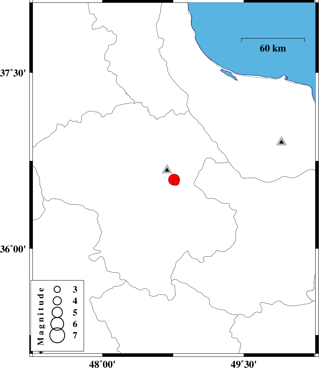 | 2008/05/27 | 06:18:04.1 | 10:48:04.1 | 36.59 | 48.76 | 14 | ML5.4 | 26 km East of Zanjan, Zanjan Province |