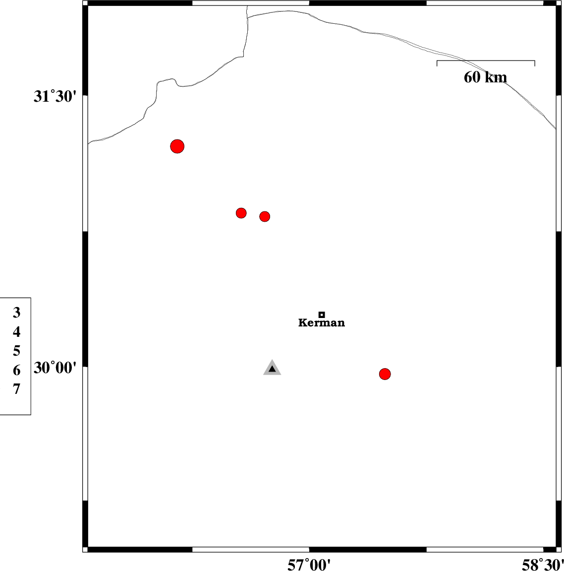 2008/05/21 | 00:59:49.9 | 05:29:49.9 | 30.1 | 57.64 | 14 | ML3 | 57 km South-East of Kerman, Kerman Province |