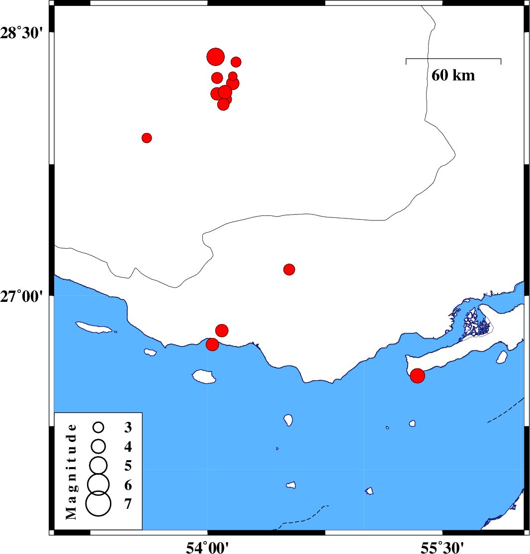 2008/05/11 | 02:48:24.2 | 07:18:24.2 | 26.72 | 54.03 | 14 | ML3.6 | Persian Gulf, 62 km South-West of Bastak | ||