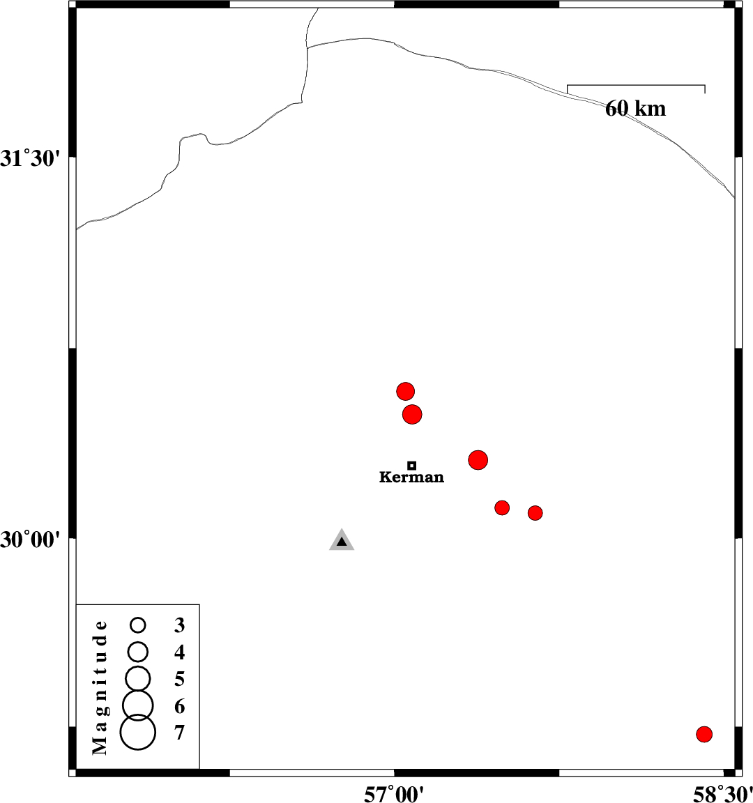2008/05/21 | 00:59:49.9 | 05:29:49.9 | 30.1 | 57.64 | 14 | ML3 | 57 km South-East of Kerman, Kerman Province |