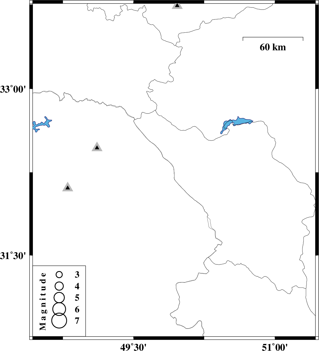 2008/06/15 | 19:47:06.8 | 00:17:06.8 | 32.26 | 49.93 | 17 | ML2.7 | 29 km South-West of Chelgard, Chaharmahal Bakhtiari Province |