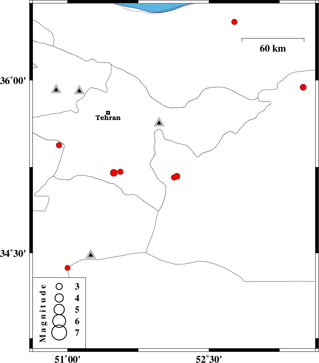 2008/05/31 | 04:42:19.3 | 09:12:19.3 | 35.44 | 50.91 | 46 | ML2.7 | 16 km West of Robatkarim, Tehran Province | ||
