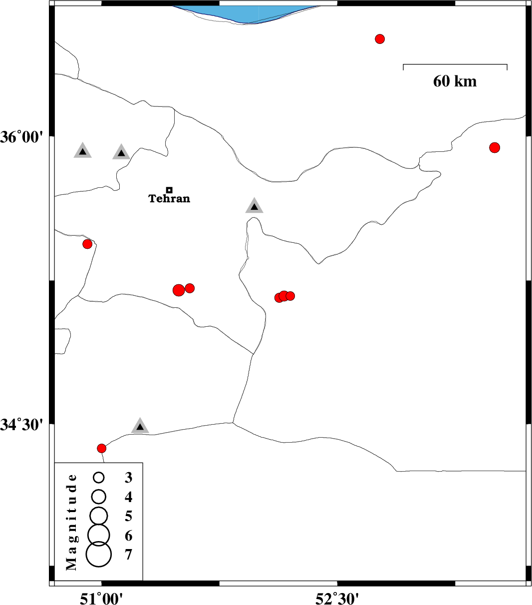2008/05/31 | 04:42:19.3 | 09:12:19.3 | 35.44 | 50.91 | 46 | ML2.7 | 16 km West of Robatkarim, Tehran Province | ||