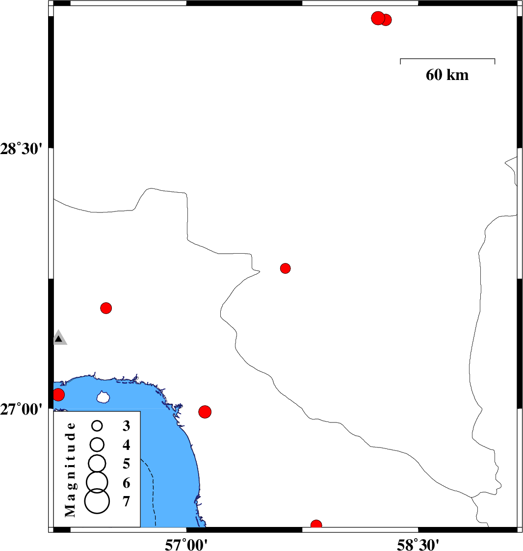 2008/06/24 | 02:01:25.7 | 06:31:25.7 | 27.81 | 57.64 | 16 | ML3 | 16 km South of Kahnuj, Kerman Province | ||