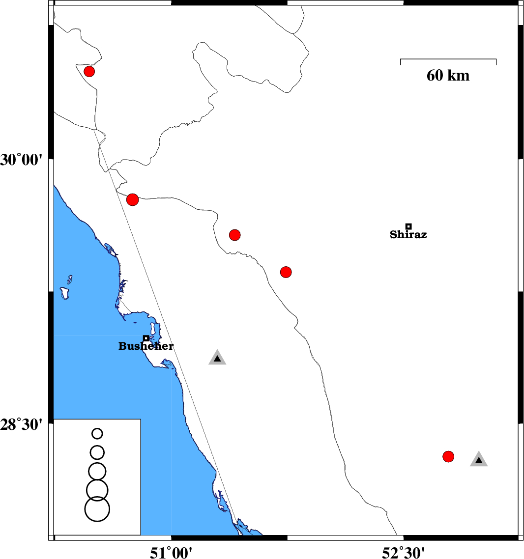 | 2008/06/01 | 05:05:56.4 | 09:35:56.4 | 29.77 | 50.75 | 12 | ML3.5 | 31 km North-East of Bandar-e genaveh, Bushehr Province |