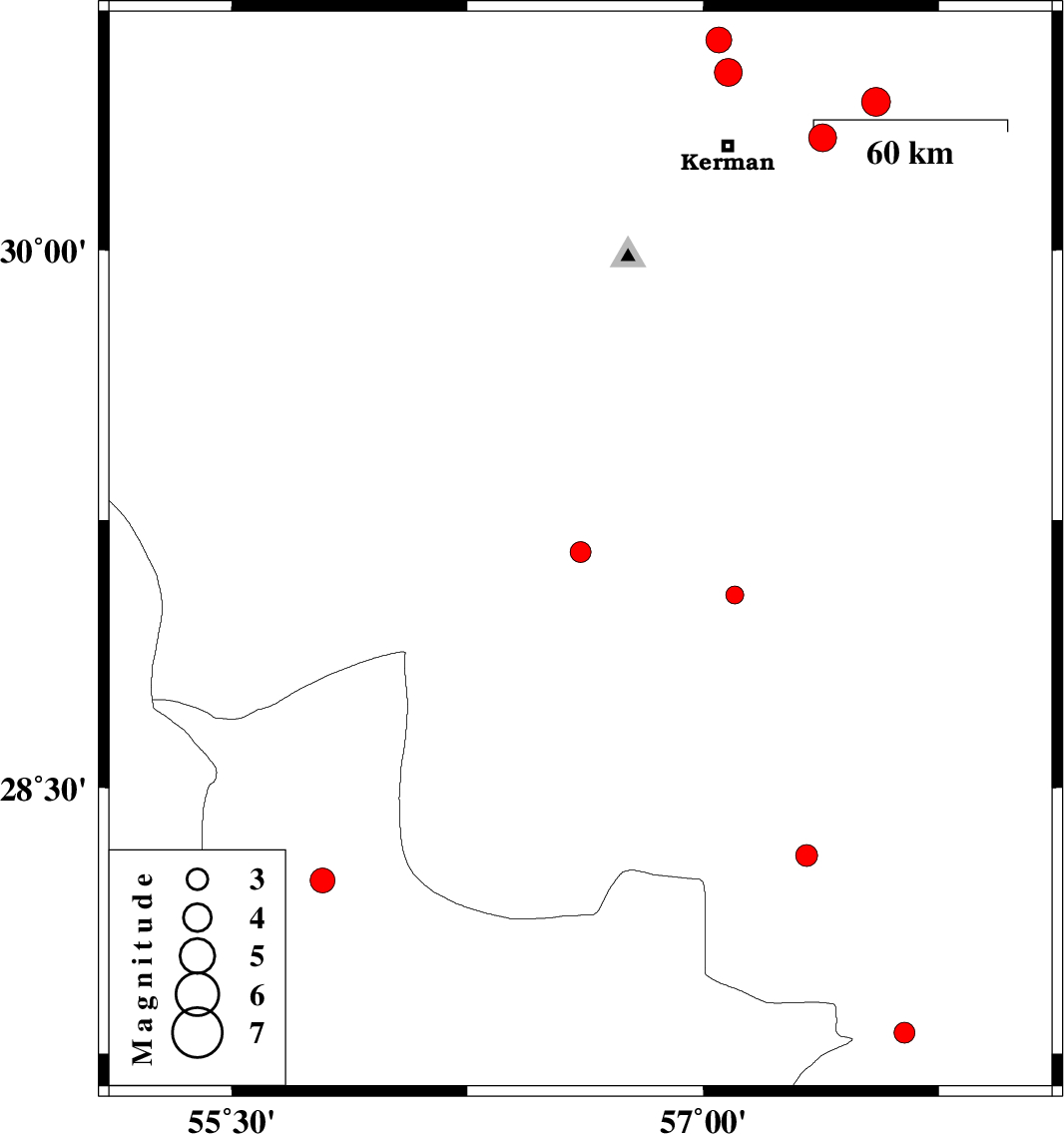 2008/06/21 | 16:21:17.7 | 20:51:17.7 | 30.41 | 57.55 | 14 | ML4.1 | 47 km North-East of Kerman, Kerman Province | ||
