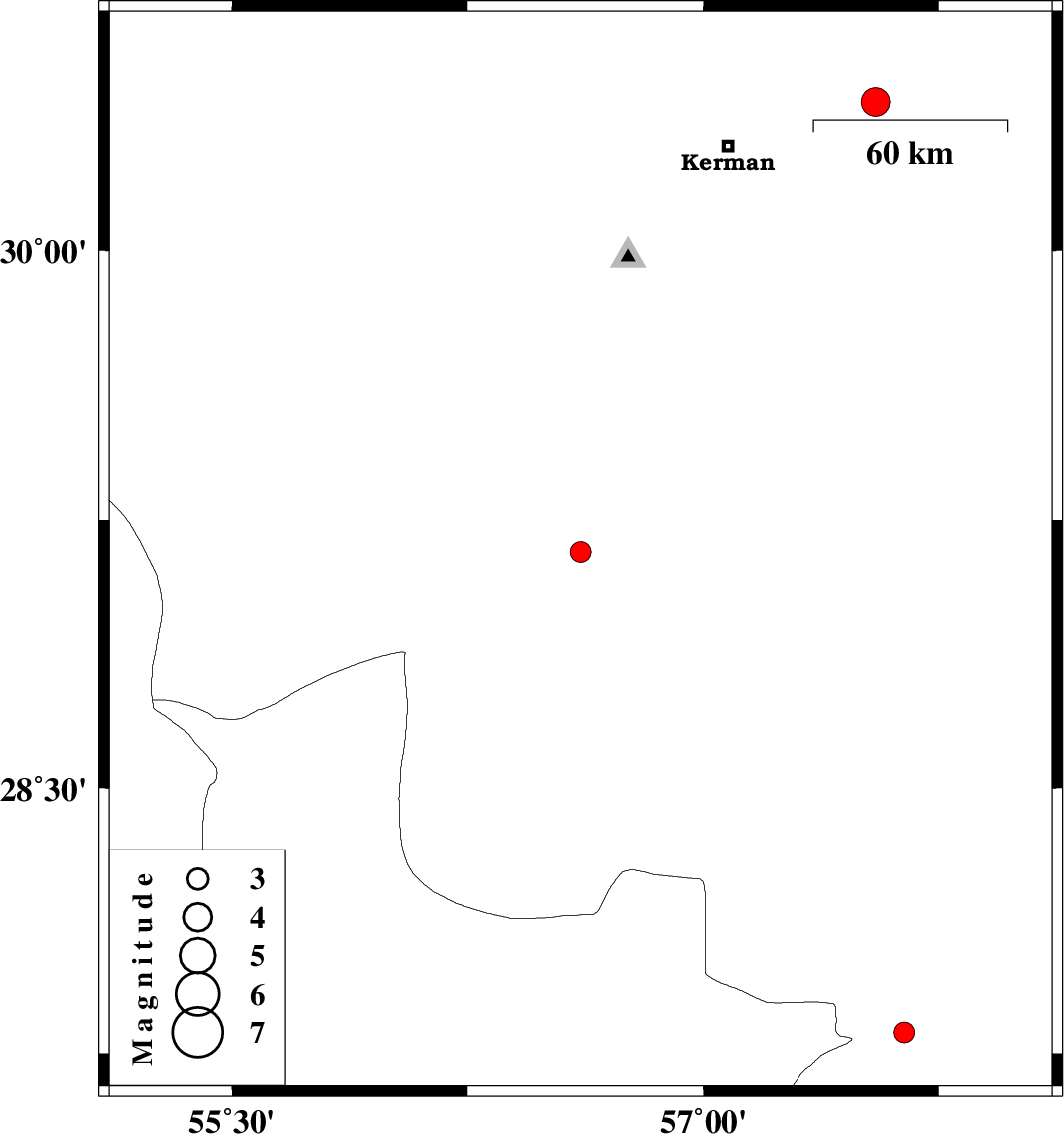 2008/06/24 | 02:01:25.7 | 06:31:25.7 | 27.81 | 57.64 | 16 | ML3 | 16 km South of Kahnuj, Kerman Province | ||