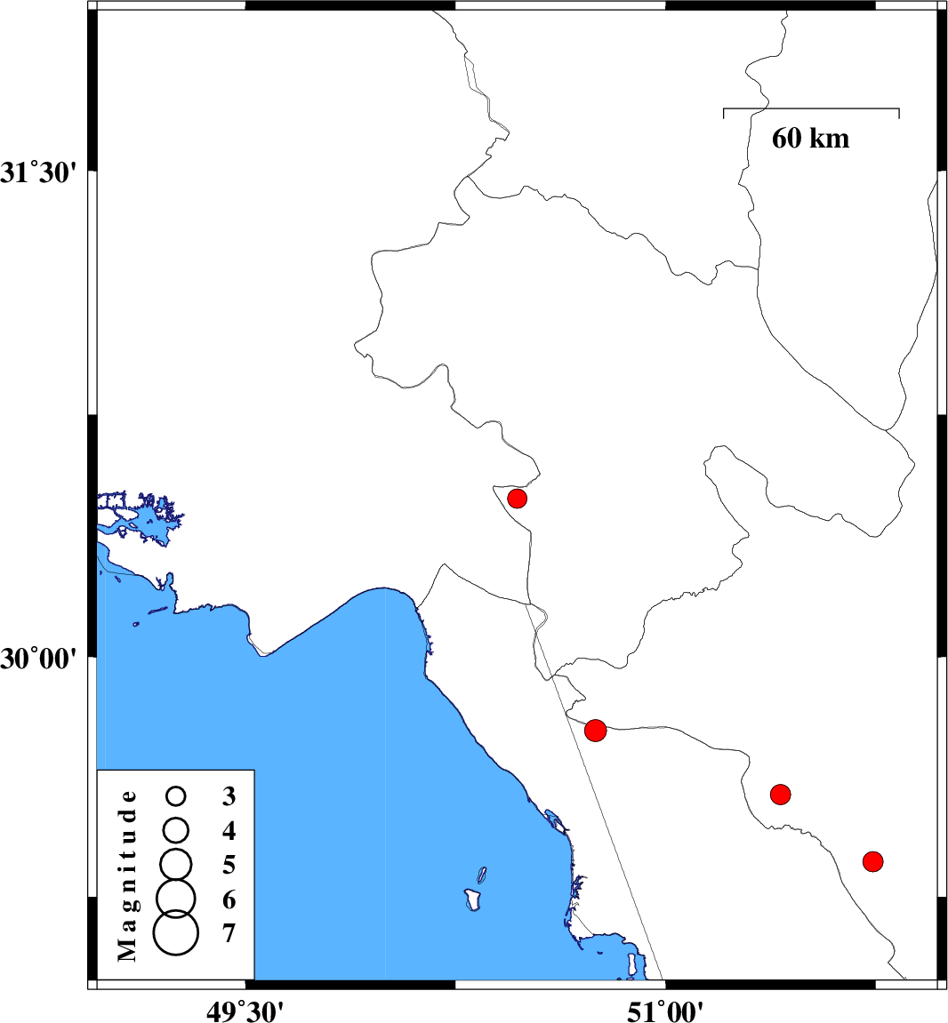 | 2008/06/01 | 05:05:56.4 | 09:35:56.4 | 29.77 | 50.75 | 12 | ML3.5 | 31 km North-East of Bandar-e genaveh, Bushehr Province |