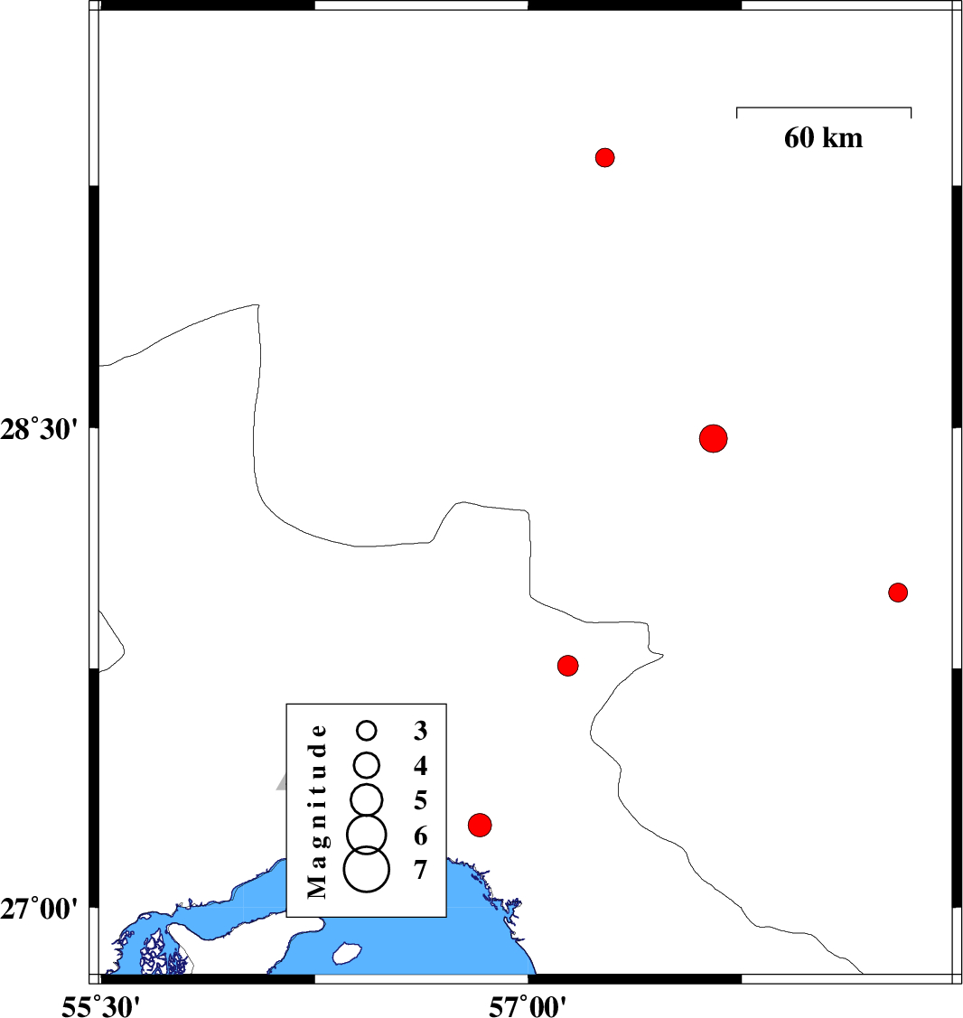 2008/06/24 | 02:01:25.7 | 06:31:25.7 | 27.81 | 57.64 | 16 | ML3 | 16 km South of Kahnuj, Kerman Province | ||