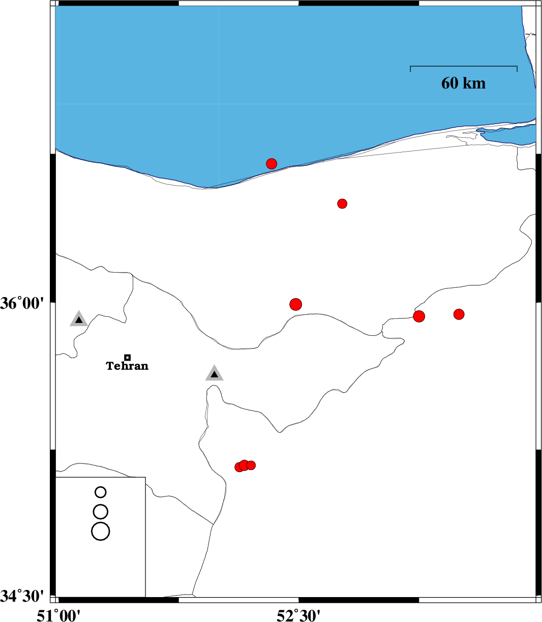 2008/06/09 | 13:38:22.7 | 18:08:22.7 | 36.7 | 52.33 | 28 | ML2.9 | Caspian Sea, 8 km Mahmud Abad |