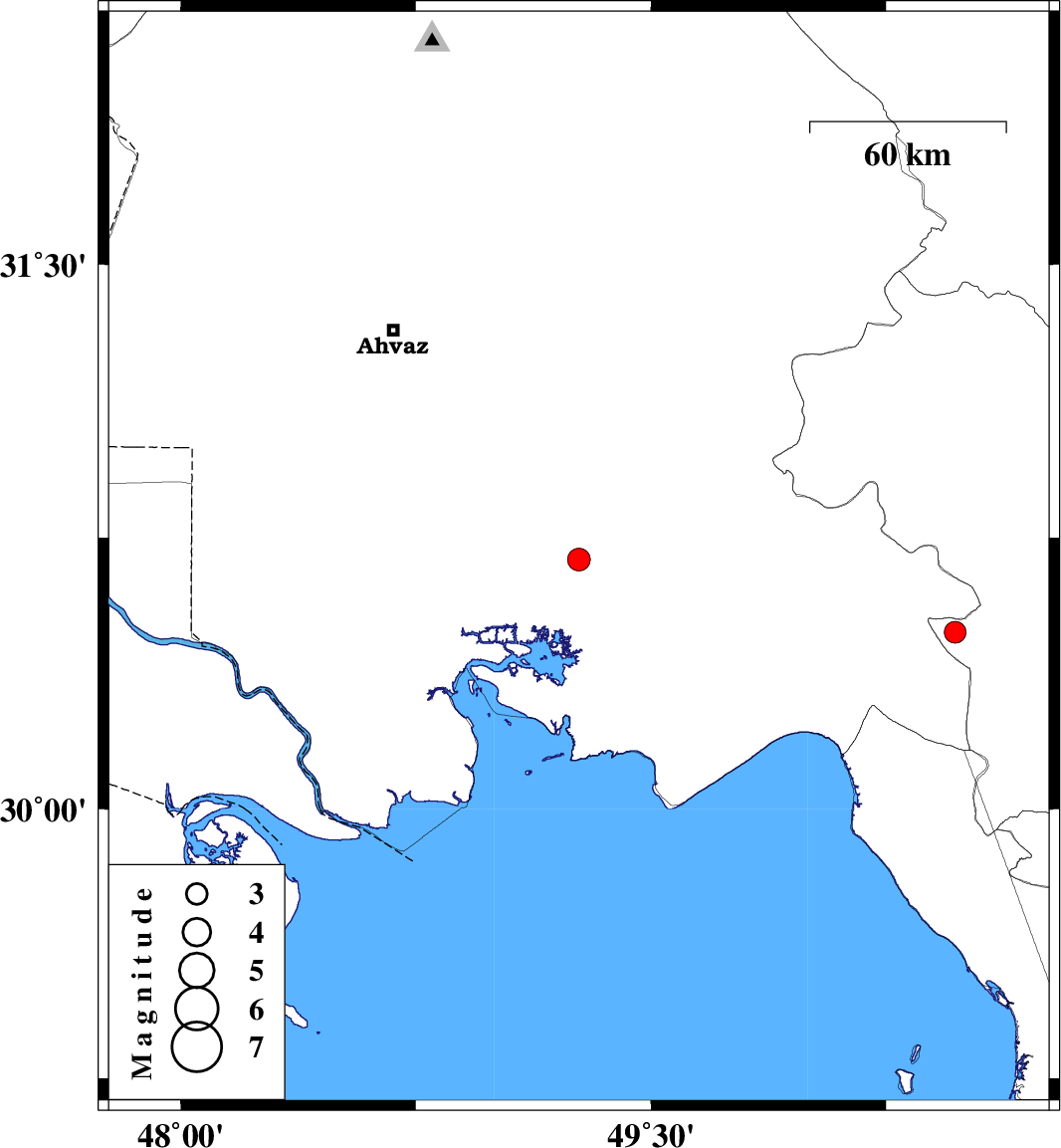 | 2008/06/29 | 13:11:07.5 | 17:41:07.5 | 30.69 | 49.27 | 14 | ML3.2 | 16 km North of Bandar-e mahshahr, Khoozestan Province | ||