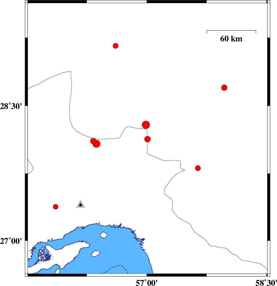 2008/06/24 | 02:01:25.7 | 06:31:25.7 | 27.81 | 57.64 | 16 | ML3 | 16 km South of Kahnuj, Kerman Province |