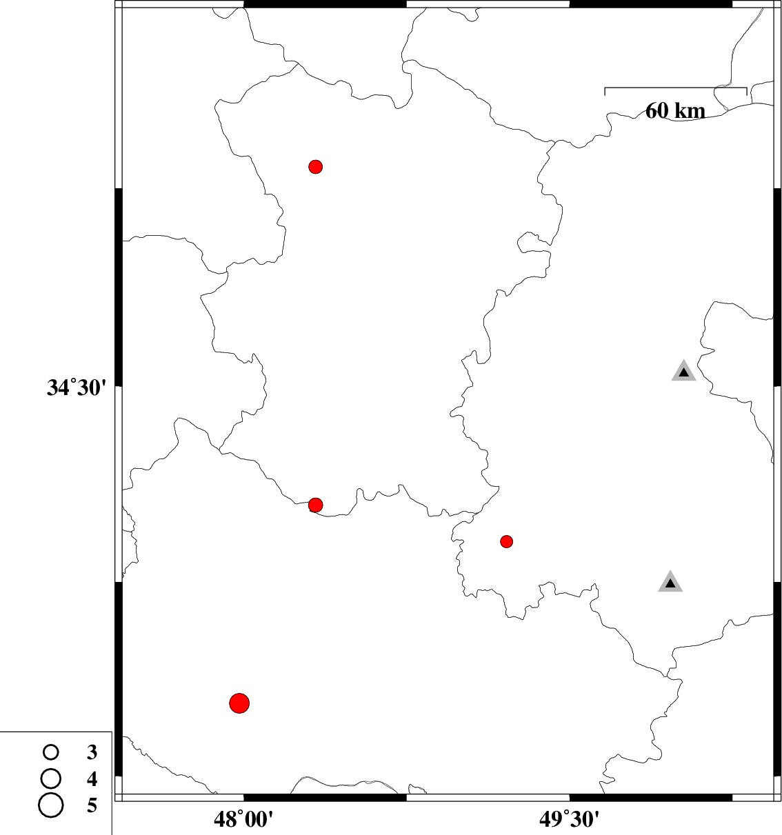 | 2008/06/25 | 09:56:20.6 | 14:26:20.6 | 33.67 | 48.59 | 14 | ML4.1 | 29 km South-West of Borujerd, Lorestan Province | ||