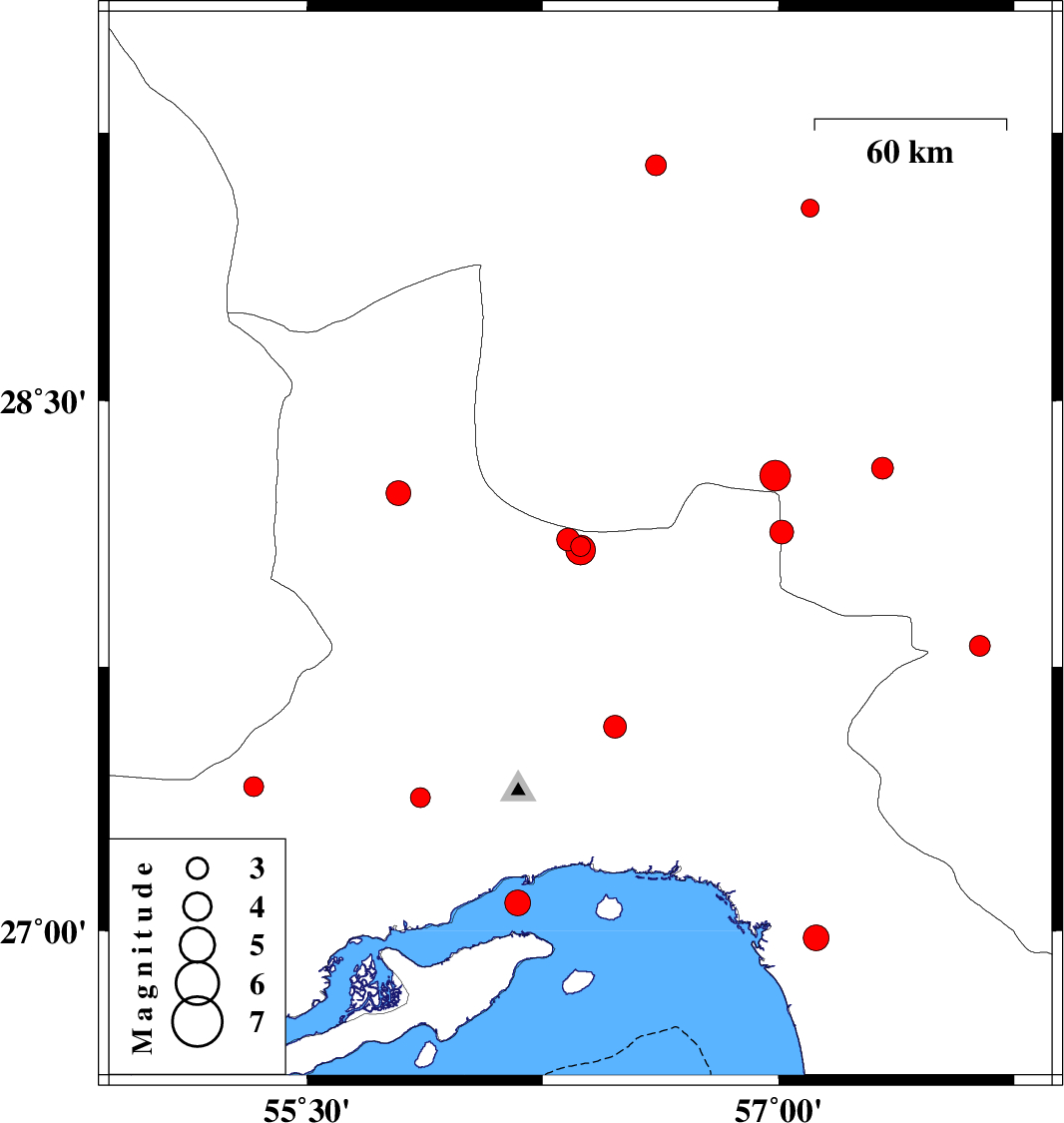2008/06/24 | 02:01:25.7 | 06:31:25.7 | 27.81 | 57.64 | 16 | ML3 | 16 km South of Kahnuj, Kerman Province | ||