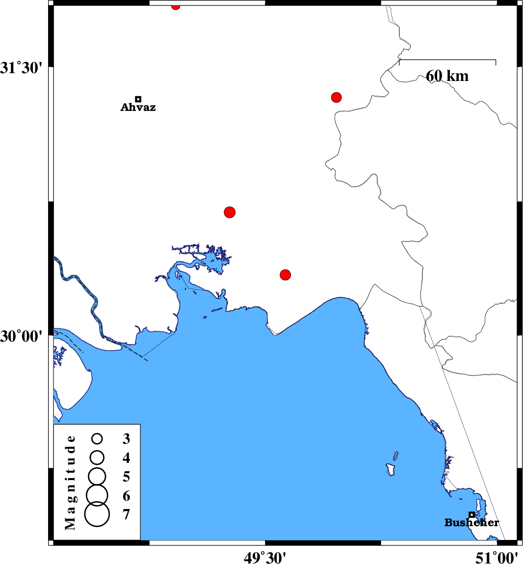 | 2008/06/29 | 13:11:07.5 | 17:41:07.5 | 30.69 | 49.27 | 14 | ML3.2 | 16 km North of Bandar-e mahshahr, Khoozestan Province |