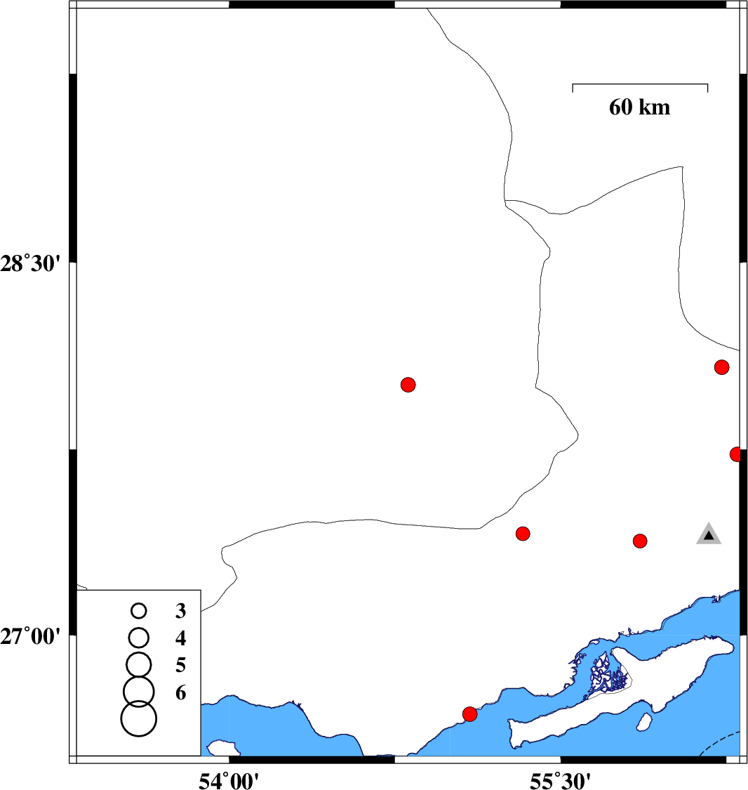 2008/06/30 | 03:41:00.8 | 08:11:00.8 | 26.68 | 55.09 | 35 | ML3 | 28 km North-East of Bandar-e lengeh, Hormozgan Province |