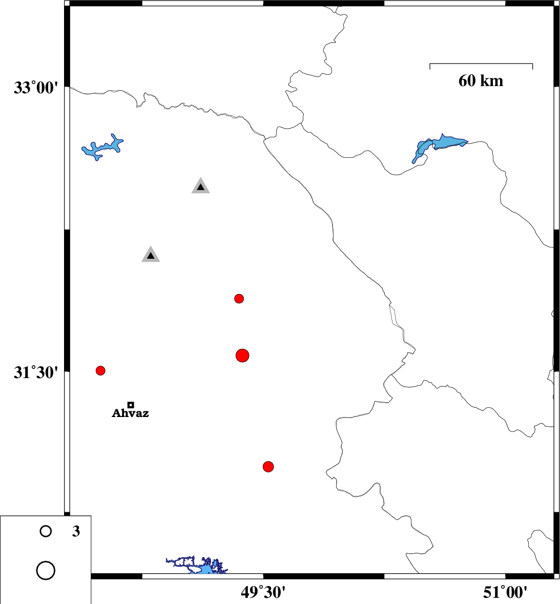 | 2008/07/12 | 09:19:56.5 | 13:49:56.5 | 31.84 | 48.92 | 5 | ML2.6 | 23 km South of Shushtar, Khoozestan Province |