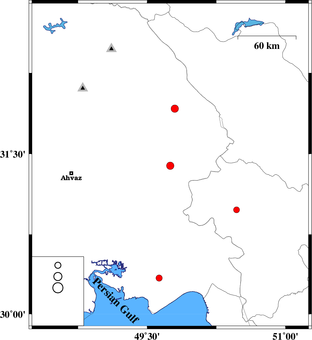 | 2008/07/28 | 09:01:44.4 | 13:31:44.4 | 30.34 | 49.63 | 16 | ML3.1 | 13 km Hendijan, Khoozestan Province |